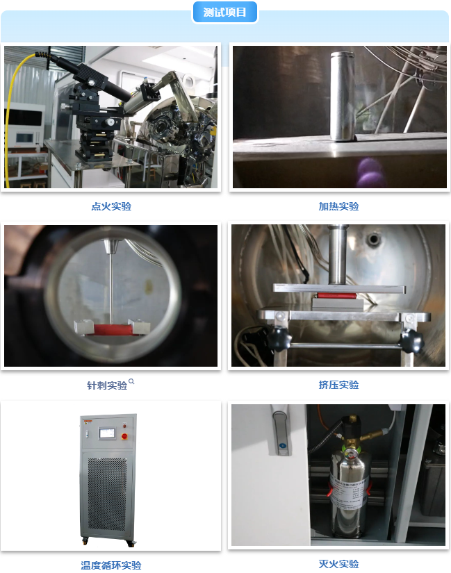 (1)點火實驗 (2)加熱實驗 (3)針刺實驗 (4)擠壓實驗 (5)溫度循環實驗 (6)滅火實驗